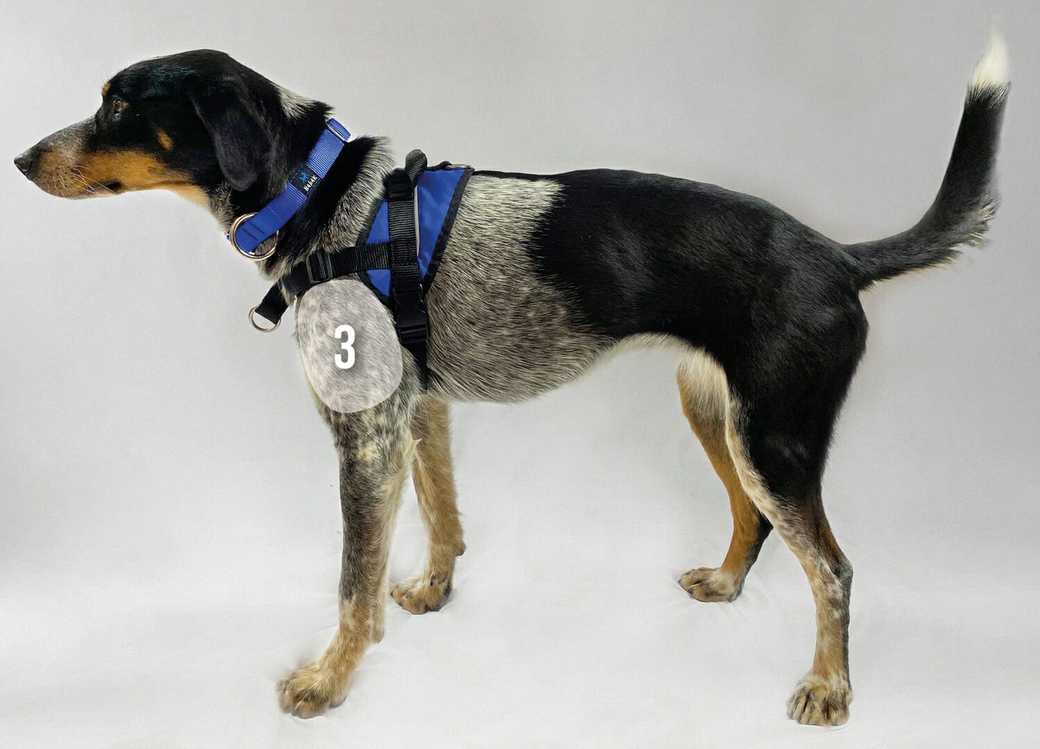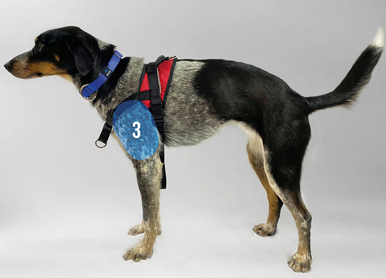 If the harness is too large, the front strap will be too low and will pass over the tip of the dog's shoulder (3).
