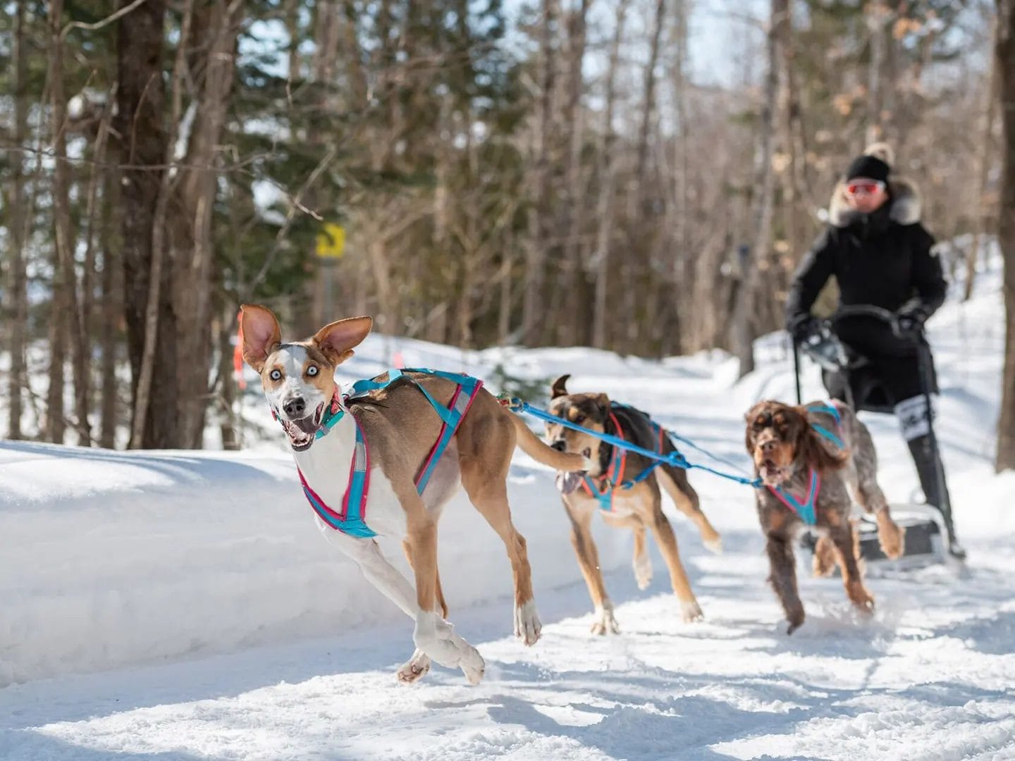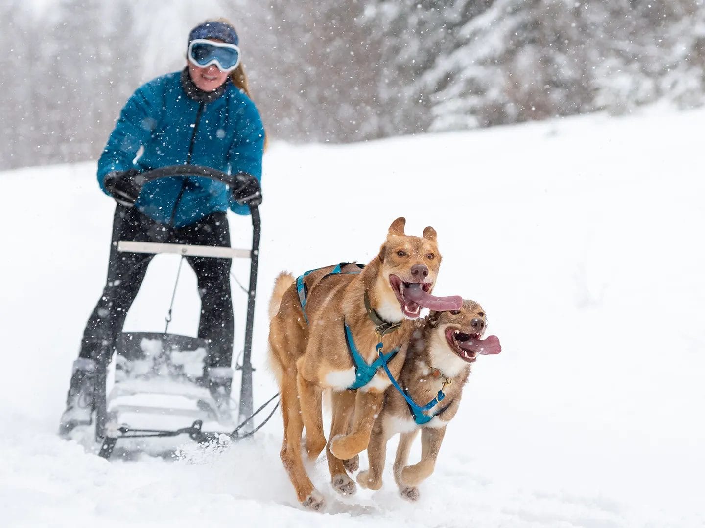 This model includes a brake (allows you to stop the kicksled and keep it in place when you are stationary), a drag mat (to slow down the dogs or control speed on a descent), and a 5,000 lb carabiner at the front to attach the bungee/rope system.